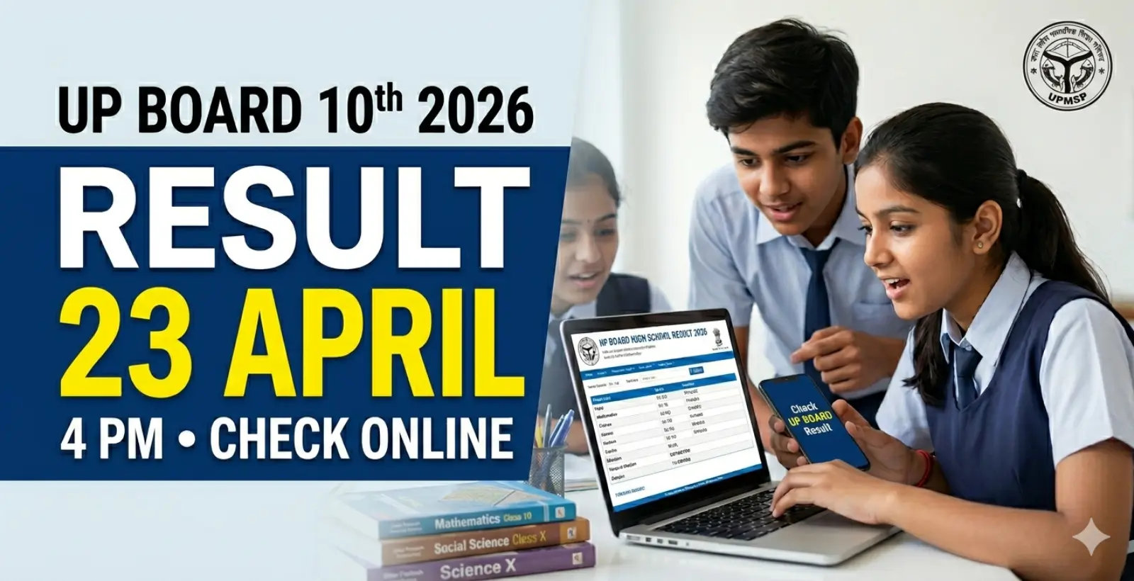 Official Confirmation (April 23, 2026): The UP Board 10th Result 2026 will be declared April 23, 2026 at 4:00 PM at upmsp.edu.in. This page covers the complete guide — pass percentage, grading system, division structure, roll number check steps, SMS method, and what to do after the result.